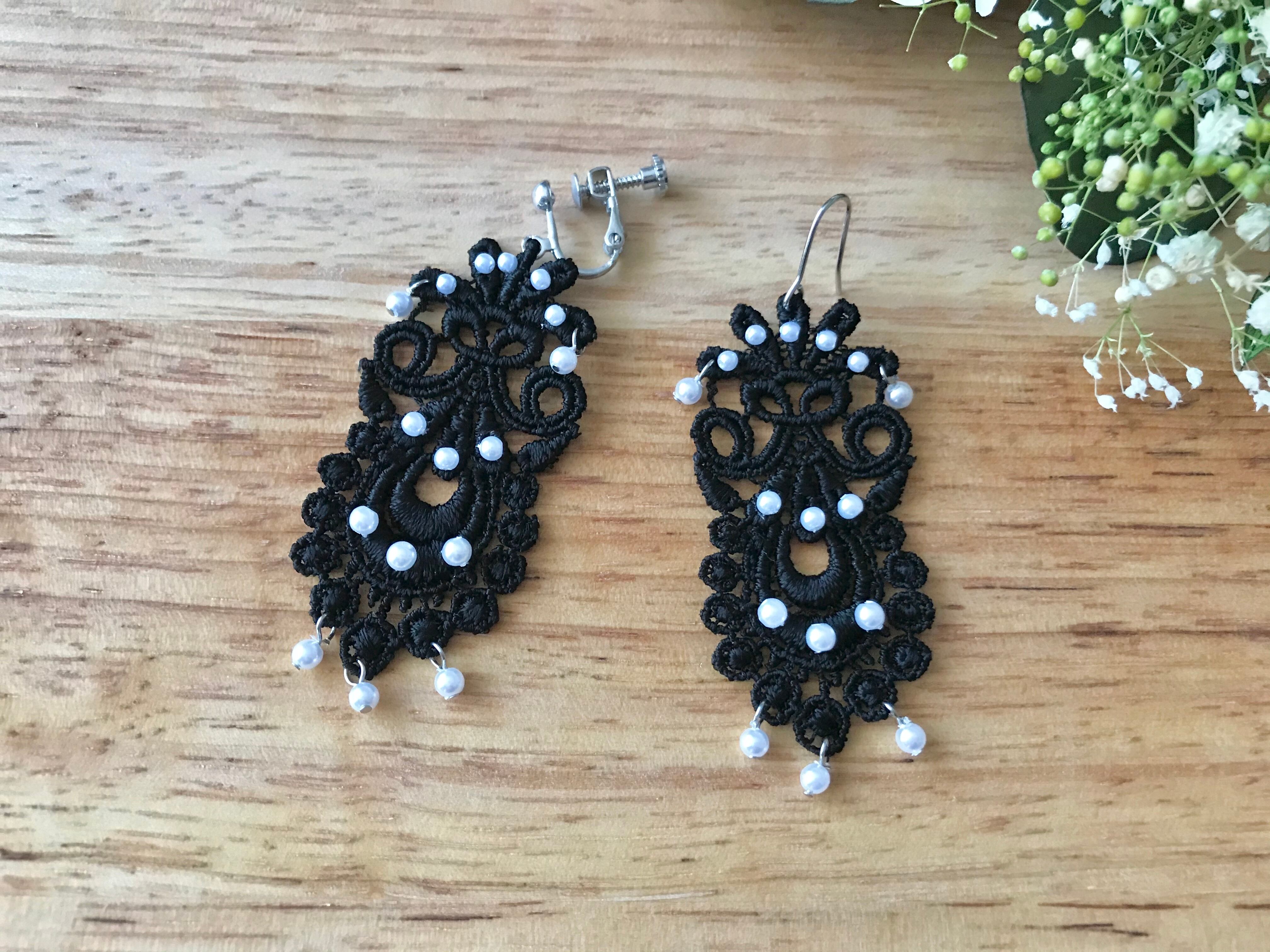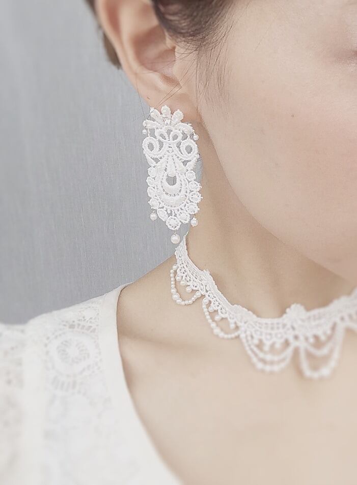 レースに小粒のビーズパールをちりばめシャンデリアのようにした耳飾り。